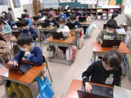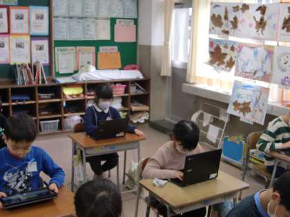 大型絵本「こすずめのぼうけん」のお話の読み聞かせを聞きました。お母さんから空の跳び方を教わり、自分で跳べるようになった嬉しさのあまり、少し無茶をして遠くまで跳んでいったこすずめのお話でした。優しい挿絵に興味をそそられながらも、こすずめが無事にお母さんすずめに会えるまでは、はらはらと心配しながらお話を聞いていた皆さんでした。読み聞かせの後は、クロムブックを用いて書きこむことで、再びとお話をふり返ることができました。