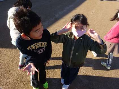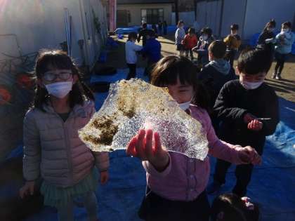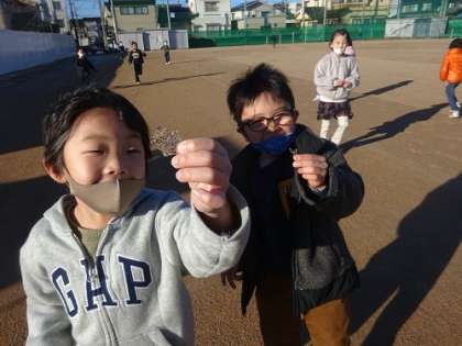 今日は、朝から気温が低く、とても寒い日でした。道路も凍結し、グラウンドでは昨日降った雨でできた水たまりが凍っていました。子どもたちは、「どうして氷ができるのだろうか」と氷ができる仕組みについて考えたり、「もうすぐ雪が降るのかな」と季節の変化を感じ取ったりしていました。そして、生活科の時間には、外に氷を探しに行きました。大きな氷を見付けて、大切そうに持ってくる子ども、氷ができる場所とできない場所があることに疑問を感じて、その理由を話し合う子どもなど、一人一人が自分の気になることやしてみたいことに取り組んでいました。寒い日でしたが、冬を楽しむ子どもたちでした。