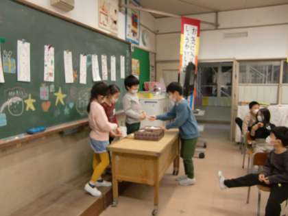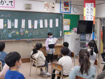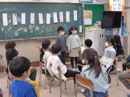 楽しく準備をして (2年生) 公開日 2021/12/23 更新日 2021/12/23 2年生 2学期もひとり一人が、そして、みんなで学習や活動を頑張りました。5時間目に、「お楽しみ集会」を開きました。ファミリー班ごとにみんなが楽しめる出し物を出しました。短い時間で、アイディアは凝らせた準備をするなど楽しくもがんばる姿は、2学期の成長を感じさせられる皆さんでした。
