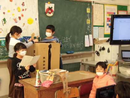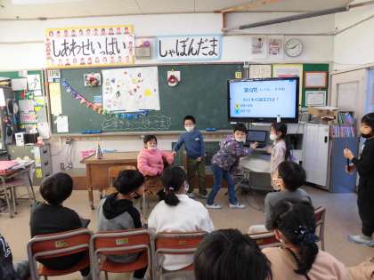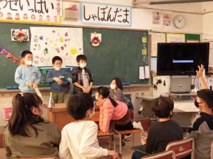12月23日に、2年4組では集会が開かれました。クイズを出すファミリー、工作で大砲を作って発表するファミリー、人形劇をするファミリー等、子どもたちはそれぞれ工夫を凝らしながら出し物を行いました。