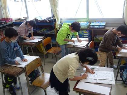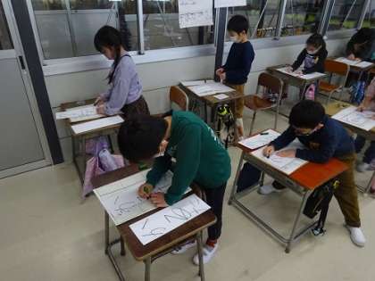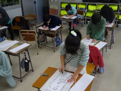 1年生にとっては、初めての書初大会を行いました。用紙が配られると、水を打ったように静かな空気が流れ、集中する姿が印象的でした。これまでの練習の成果を発揮しようと、真剣な表情がたくさん見られました。