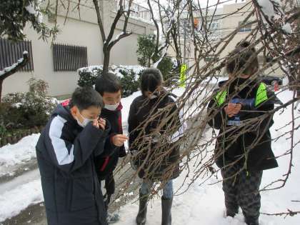 理科「寒くなると」の学習をしています。植物の様子の変化や虫たちがどのように過ごしているのかを観察しに外に出かけました。冬芽を見付けたり、石の裏で静かに冬を越そうとしている虫を発見したりして、驚いている子どもたちでした。