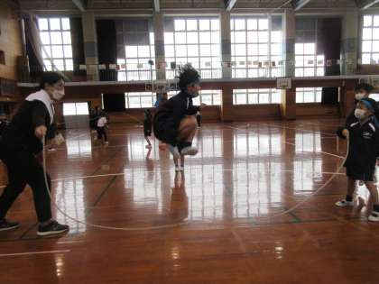 体育や自主活動の時間等に長縄跳びに挑戦しています。最初は、こわがっていた子どもも何度も練習をすると、跳べるようになりました。リズムよく続けて跳ぶことができるように、練習を続けていきます。