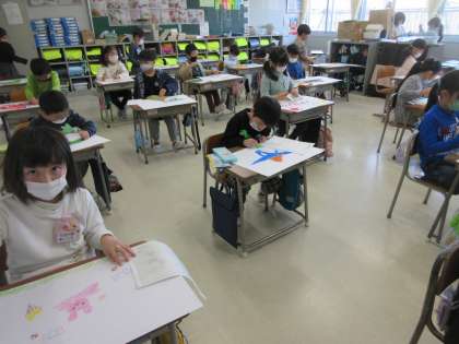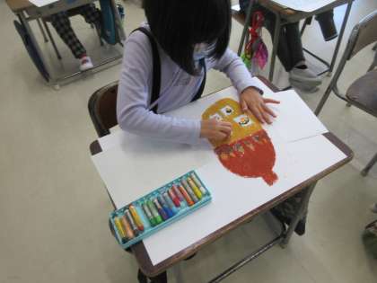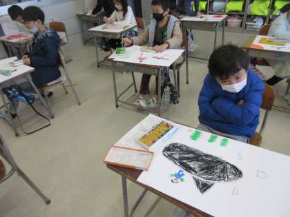 図画工作科「のってみたいな いきたいな」の学習を進めています。今日は、クレヨンを使って、乗りたいものや行きたいところを考えながら、絵に表しました。恐竜や動物に乗ったり、宇宙やお菓子の国に行ったりと、楽しい作品をつくっています。