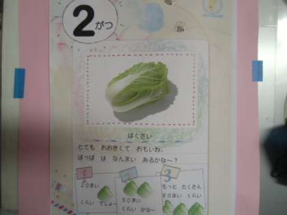 給食室の近くに「白菜クイズ」が掲示されています。だいたい一玉に葉っぱは何枚あるのか考えてみてくださいね。答えも書いてありますよ。