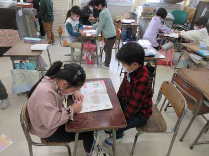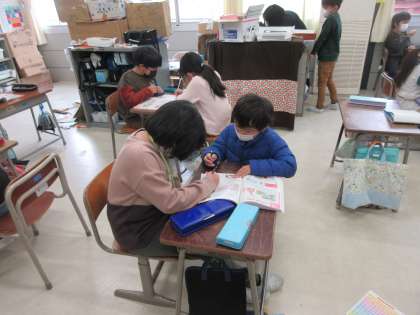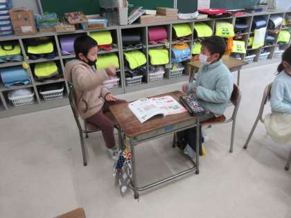 算数科「どちらがひろい」の学習で、ますの数による面積の比べ方を理解するために、陣取り遊びをしました。感染症対策のため小さな声で行いましたが、「勝ちたい」思いが溢れる子供たちの姿が見られました。
