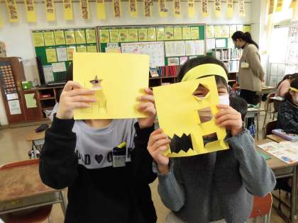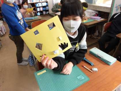 今日は、早速カッターを使って、窓をつくる練習に取り組みました。「こんな窓ができたよ」「楽しいな」と窓をつくって覗き込むことに心を弾ませる子どもたち。「次の図工が楽しみだよ」と楽しそうに話す様子が見られました。