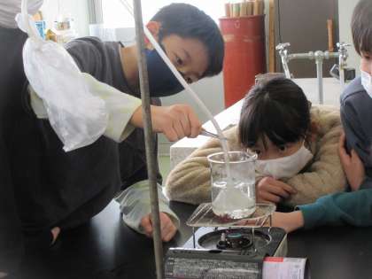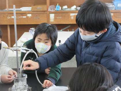理科「水のすがたと温度」の学習では、沸騰したときにあらわれる泡の正体を探るために実験を行いました。泡を集めていくと袋の中に変化が見られ、子どもたちは驚いていました。1年間で、実験を繰り返してきたことで、実験結果も考察も上手に書き進められるようになった子どもたちです。