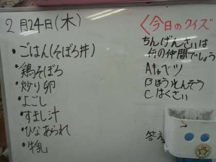 今日は、一足早く、ひなまつり献立です。ひなまつりは、女の子の健やかな成長を願う行事です。ひなまつりの行事食には、ちらしずしやはまぐりのお吸い物、甘酒、ひなあられなどを食べます。