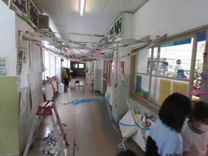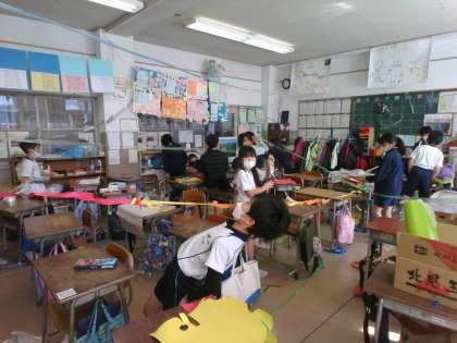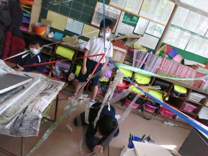 図画工作科「つないで つるして」の学習を行いました。新聞紙、色画用紙、紙テープなど様々な材料をつなぎ、思い思いの場所からつるしました。