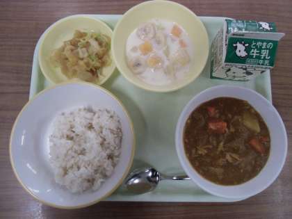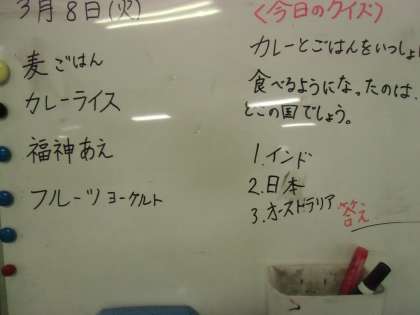 今日の給食 公開日 2022/03/08 更新日 2022/03/08 給食室 今日は、みなさんに人気のあるカレーライスの日です。明治時代には、アメリカやヨーロッパの文化が日本に積極的に取り入れられ、そのおりに、イギリスからカレーが伝わりました。