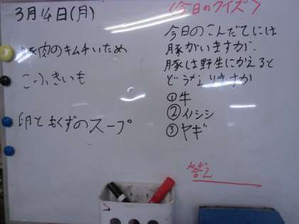 今日の給食 公開日 2022/03/14 更新日 2022/03/14 給食室 キムチは、発酵食品といい、日本のつけものと同じです。つけものは、塩、す、酒粕などとたべものを一緒につけこんで、保存性を高めるとともに熟成させて風味をよくしたものです。