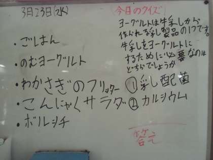 今日で、今の学年で食べる給食も最後となりました。この1年間をふりかえってみましょう。苦手だったものが食べられるようになったり、給食時間にできることが増えたりしていたら、すてきですね。新しい学年でも落ち着いて給食じかんを過ごしましょう。