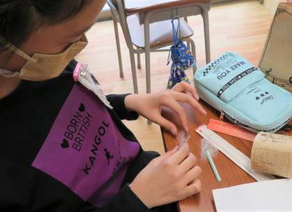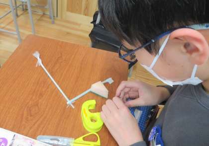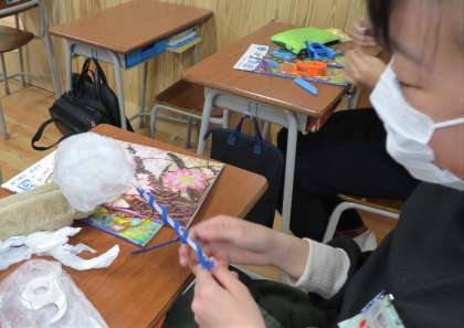 6年生は図工の時間に「おもしろ筆」の学習を始めました。身の回りにある材料を組み合わせて、オリジナルの筆を作り、その筆で作品を描く予定です。