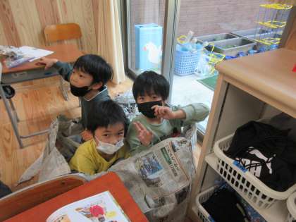 図画工作科「しんぶんしとなかよし」の学習をしました。新聞紙の触った感じを生かしながら、思いついたことを試してみました。テントを作ったり、お化けになりきったりする中で、新聞紙の多様性に気付く子どもたちの姿が見られました。