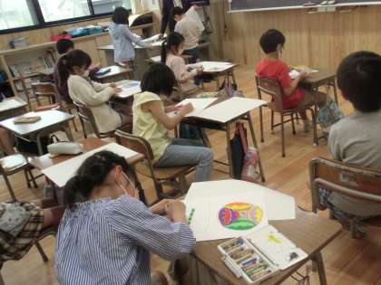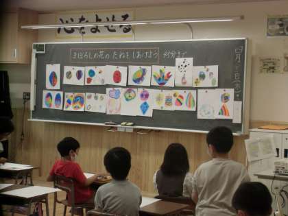 図画工作の学習で「まぼろしのたね」を描いています。にじみやぼかしを生かしながらおもしろい種を描いています。ここから「まぼろしの花」を描いていく予定です。どんな花が咲くのか楽しみですね。