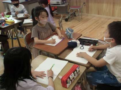 「きつつきの商売」で物語の続きとして第3場面をファミリーで考え始めています。登場人物や天気などを考えながらオリジナルの物語を考えていきます。どんな物語になるのか楽しみです。