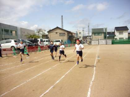 4年生になって、初めての記録会が行われました。4年生からは、100メートルを走ります。カーブのあるトラックで、速度を落とさずに走り続ける体力も求められてきます。昨年度の12月以来の記録会に、子どもたちからは「緊張するなあ。」「どきどきしてきた。」などといった言葉が聞こえてきました。