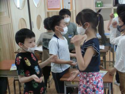 今日は、自分の気持ちを英語で伝えてみました。子どもたちは楽しそうに友達と関わり、自分の今の気分を伝えていました。