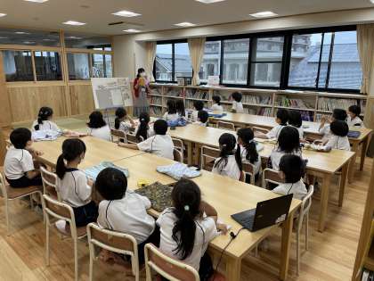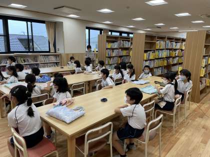 新しくなったすてきな学校図書室でオリエンテーションをしました。司書の高橋先生から、図書室利用についてや、先生の作られた「金太郎」のパネルシアターをみせてもらいました。