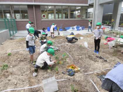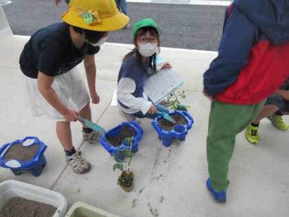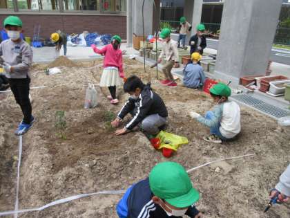 今日、野菜の苗や種を植えました。「はやくトマトを収穫したいな」「虫に食べられないようにしないとな」「カレーを作りたいな」など、子どもたちは、いろいろな思いをもって、植えています。