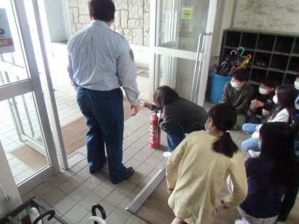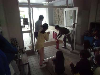 防災教室に参加しました(5年生・その2) 公開日 2022/05/10 更新日 2022/05/10 5年生 バッジ授与式の後、防火教室を行いました。クラスごとに消火器体験を実施し、いざという時、すぐに使えるよう、消火器を使う手順を把握する大切さを強く感じている子どもたちの様子が伺えました。また、消火器に重量がある場合、1人だけで消火しようとせず、近くの大人と協力して消火に臨みたいと考える子どもの姿も見られました。