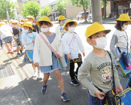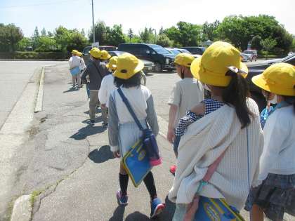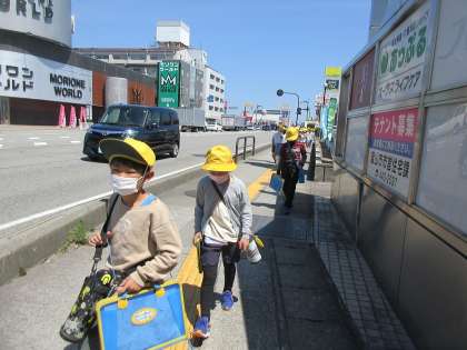 社会科の学習で2回目の校区探検に行きました。今回は、学校の南側と西側を歩きました。41号線沿いは車が多く通っていることや市電通り沿いには店が多く並んでいることを感じながら歩いていました。