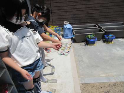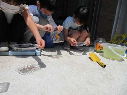 図画工作科「ひかりのプレゼント」の学習が始まりました。今日は、透明な容器に色を塗って、光を通してみることを試しました。容器の形や色によって、様々な形や色が映り、「花が咲いているみたい」「面白い形ができたよ」などと話しながら、楽しく活動している子どもたちでした。