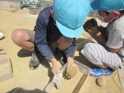 子どもたちは、宝石を扱うようにように丁寧に磨いたり、できるだけ小さい粒の土を集めたりするなど、思い思いのどろだんごに向けて取組を続けています。