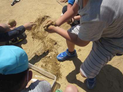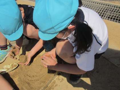 2組は生活科の学習でどろだんごづくりに取り組んでいます。