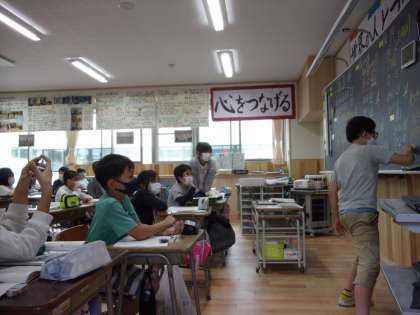 算数科の学習では、割り算の学習を進めています。割り算の方法について、自分の考え方を仲間に説明しました。みんなに伝えようと、何度も説明したり、黒板を使って式や図を書きながら説明したりしました。聞いている子どもたちも、一回では理解できなくても質問をしたり、問い返したりしながら、仲間の考えを理解しようと一生懸命考えました。「ああ〜!そういうことか!」「このやり方おもしろい!」などと、納得し認め合う姿が素敵でした。