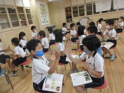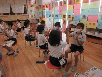 音楽科の時間に「茶つみ」の歌に合わせて、ペアで手遊びを行いました。手を打ったり、相手とタイミングよく手を合わせたりするのは、難しいところもありますが、上手にできるようになると楽しさを感じ始め、休み時間にも仲間と遊んでいる様子も見られました。