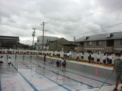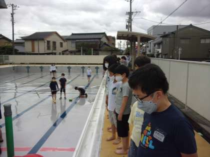 4年生は、高学年がプール清掃を行っている姿を見させてもらいました。汚れがたくさんあったプールがみるみるきれいになっていく様子や、たわしで一生懸命こする姿、細かいところまで気を配り働きかける高学年の姿に、心を動かされたようです。その日の日記に、「下級生のために働く高学年のみなさんはかっこいいと思った。来年は、あんな風に下級生や学校のために動ける高学年になりたい」と書いていた子どももいました。プール清掃に取り組む高学年の姿に、あこがれの気持ちを強くし、来年の自分をイメージし始めた子どもたちです。