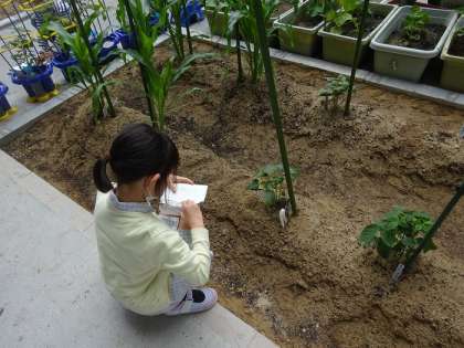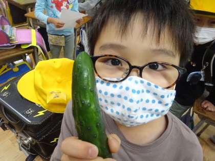 生活科の学習で育てている野菜に実がなり始めています。キュウリやミニトマトを初めて収穫して嬉しそうな顔が見られます。まだ自分の野菜に実がならない子どもたちも、毎日観察を行う中で、葉の枚数や茎の太さ、花の様子等に目を向け、日々の生長に気を留めながら自分の野菜を見守っています。葉にアブラムシが付いているのを見付けた子どもたちの中には、すぐに対策法を調べて、次の日には酢を混ぜた水を持って登校してきたり、ガムテープを持ってきてアブラムシをくっつけて取ろうとしたり、一生懸命に野菜を守ろうとする姿もあります。虫や病気に負けず、野菜たちがこれから更に大きく育っていくことを願っています。