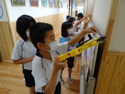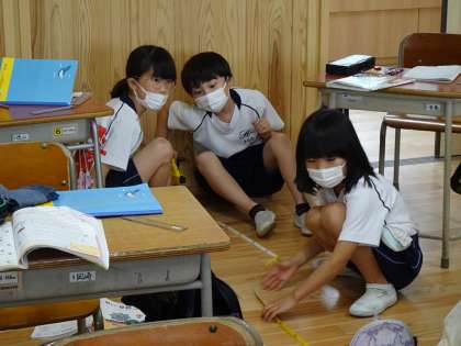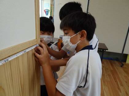 まきじゃくを使って、教室、廊下など、色々な物の長さを測りました。