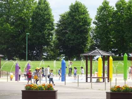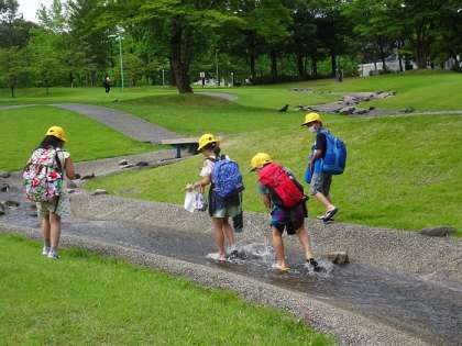 午前中の活動の様子です。水辺の広場やせせらぎの道の小川、噴水パラダイス等、ファミリーで計画した場所で元気に活動していました。