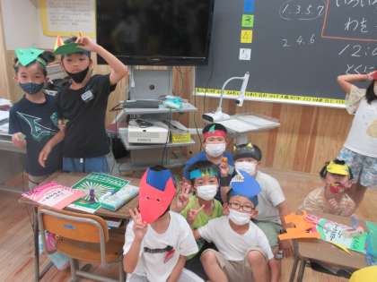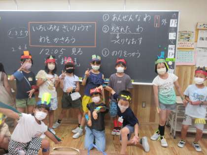図画工作科「わっかでへんしん」の作品が完成しました。材料の組み合わせ方を工夫して、飾りをつけて変身しました。