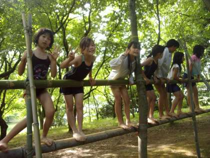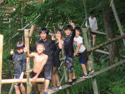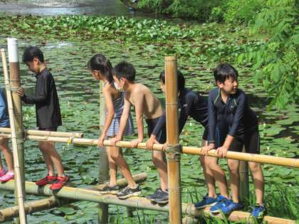 竹ジャングルや池ジャングルでは、森の中に竹で設置されたジャングルに挑戦しました。竹を手と足でつたい、森や池に落ちないように、くぐりぬけていきます。慎重に渡ろうとする人もいれば、素早く軽快に進んでいく人もいました。