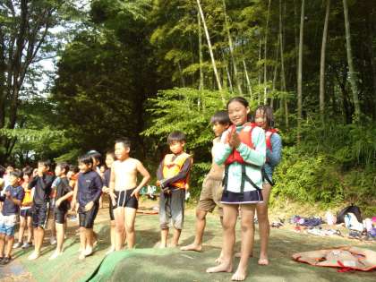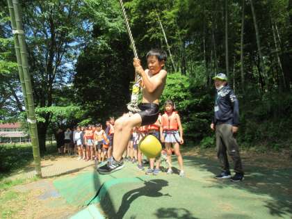 ターザンロープでは、ロープにつかまって勢いよく池に向かって飛び出します。そしてその先で手を離し、池にダイブ!子どもたちは次々と池に飛び込んでいきました。
