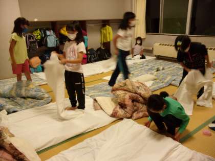 池でたくさん遊んだ後は、入浴し、夕食をいただきました。合間には、荷物の整理やベッドメイキングも進めていました。しおりを確認し、次の行動を確認している姿もありました。