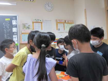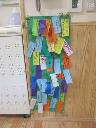 今日は、七夕です。イベント係が企画した七夕祭りの会がありました。みんなの願いを聞き合った後、笹の葉の掲示に貼ったり、くじをしたりしました。学級の仲間と楽しい時間を過ごしました。