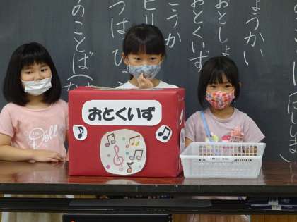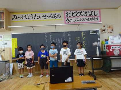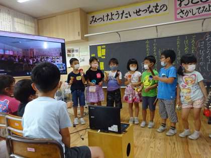 音楽科の学習で見付けた身の回りにある音を、クイズにして紹介したり、歌に合わせて演奏したりして、1年2組や3組の仲間にオンラインで伝えました。子どもたちは慣れない司会や始めの言葉等にも挑戦し、自分の音がどのような音なのか、相手に伝えるために何度も練習を繰り返しました。本番は緊張している子どももいましたが、自分の音を誰かに伝えることをとても嬉しく感じているようでした。発表会の後にもらった感想メッセージを読んで、自分が表現したことが、相手に伝わる喜びを味わっていました。