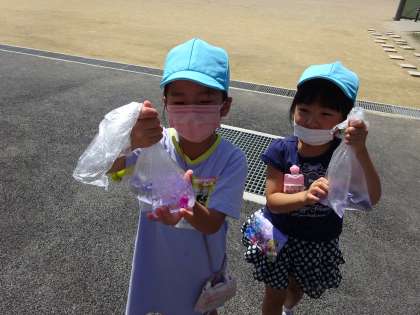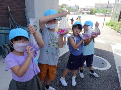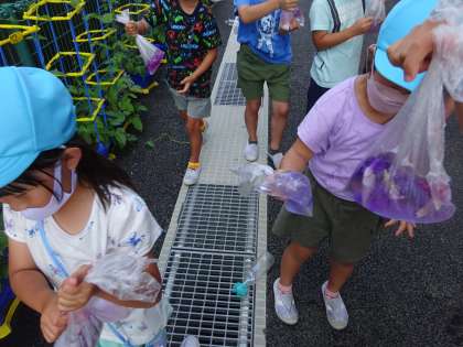 生活科「ぼく、わたしのあさがお」の学習では、あさがおの花を摘んで、色水遊びをしました。「ぼくのあさがおはピンクの色だから、ピンクの色水ができるかな」「私のは青と紫色だから、一緒に入れたらどんな色水になるか楽しみ」と、子どもたちは自分のあさがおの花を大切そうに摘み取ると、袋の中でもみもみ。「先生、あさがおジュース飲みたくなったよ」と目をキラキラと輝かせていました。