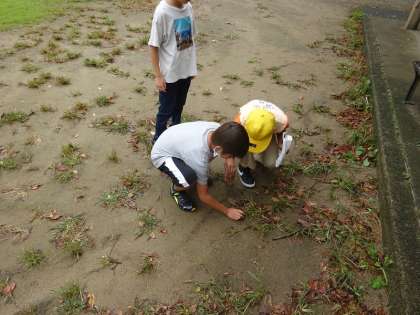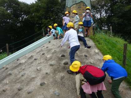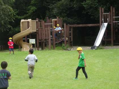 芝生広場での様子です。広場で走り回ったり、遊具で遊んだり、虫を捕まえたりして過ごしていました。