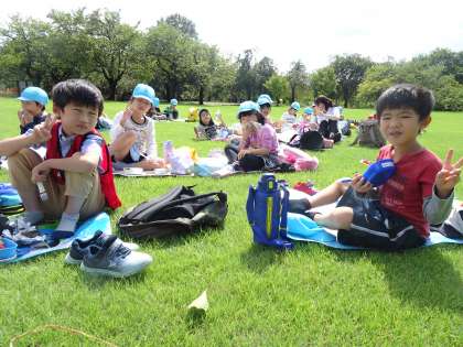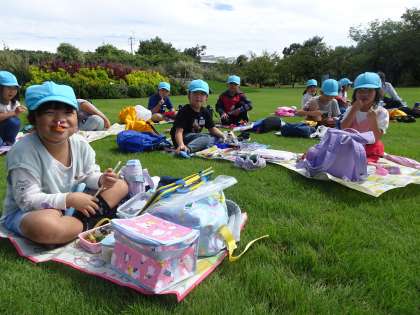 フローラルステージの芝生広場で昼食を食べました。ファミリーごとに敷物を引き、楽しくお弁当を食べました。朝からの雨がうそのように上がり、秋晴れの中、涼しい風心地よい一時でした。