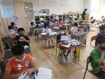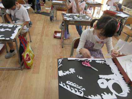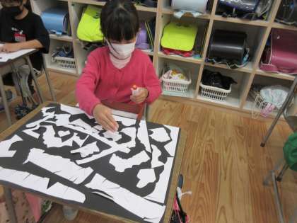 4限目の図画工作科で、「はさみのアート」をしました。白色の画用紙をいろいろな形に切って、黒色の画用紙に工夫しながら貼りました。波やジグザグ、グルグルと紙を動かしながらハサミで切りました。また、のりで貼る際には、縦横斜め等のいろいろな方向に切った画用紙を置いて、作品づくりを進めていました。
