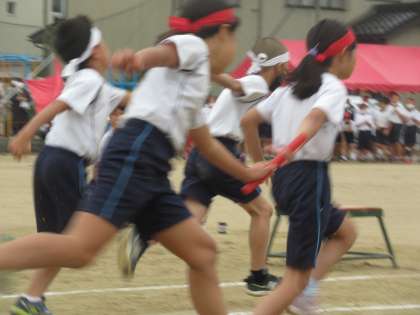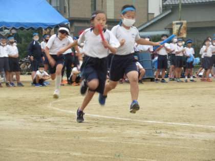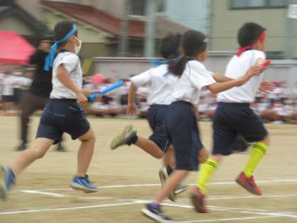 徒競走の次は、学年リレーでした。体育の時間以外にも、進んで練習を行ってきたバトンパスは、どんどん上手になっていきました。バトンゾーンでは、仲間を信じて前を向いて走り、バトンをしっかりと受け取りました。途中、転んでしまったり、大差をつけられてしまったりしても、どのチームも最後まで諦めずバトンをつなぎ、走りきることができました。