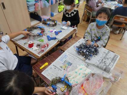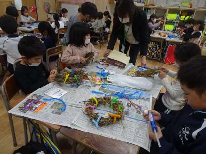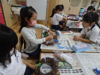 生活科「ぼく・わたしのあさがお」の学習でこれまで育ててきたあさがおのつるを使って、リースをつくりました。子どもたちは、富山県中央植物園でどんぐり工作をした時に、グルーガンを使ったので、とても器用に木の実や飾りを貼り付けていました。秋を感じさせるものやハロウィン等の行事をテーマにしたもの等、一人ひとりが思いに合った作品を仕上げていました。
