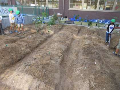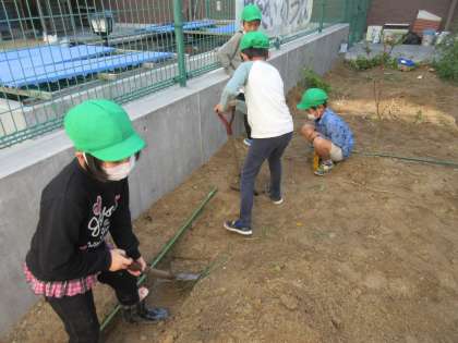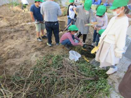 冬にむけて、「野さいのうえん」づくりを進めています。「一人では難しいけど、みんなで協力すればできるから、みんなでみんなの野菜農園をつくりたい」とうAさんの思いを聞き、皆で取り組むか一人で取り組むかを決めて、活動を進めています。枯れた野菜で堆肥づくりをしたり、畑を耕して冬野菜を植えたりしています。