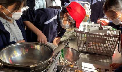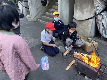 くらしをつくる宿泊学習(5年生・その3) 公開日 2022/11/10 更新日 2022/11/10 5年生 野外炊飯では、兄弟ファミリーで「ファミリーピザ」「自分たちで考えたメニュー」を作りました。火起こしをする子ども、ピザ生地を練る子ども、その間に洗い物をする子どもなど、一人ひとりが自分にできる役割を見付けて、進んで働く姿が印象的でした。
